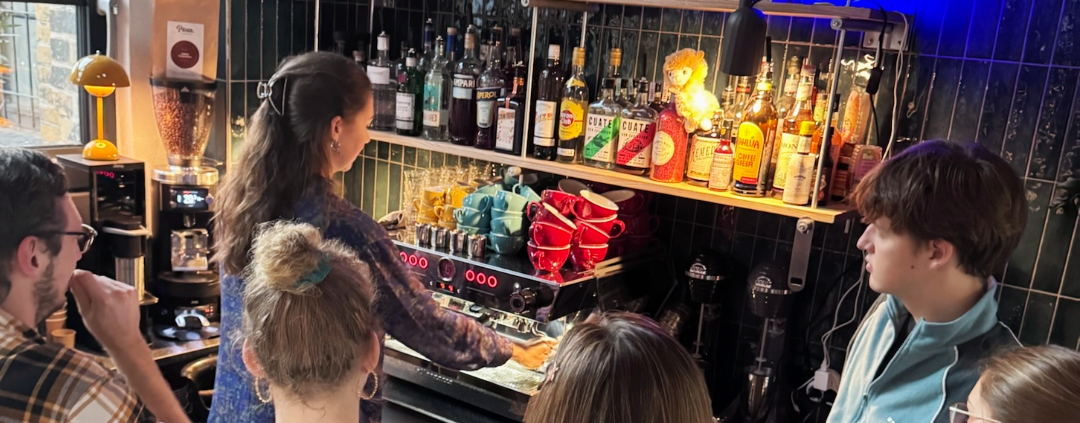 Dafür sind keinerlei Vorkenntnisse notwendig. Wir geben euch eine kurze Einführung in den Ursprung von Kaffee, den Workflow an der Siebträgermaschine, begleiten euch beim Espresso-Bezug und Milchschäumen und gehen auf eure Fragen und Impulse ein. Die Kurse dauern gut zwei Stunden, ihr habt viel Gelegenheit zum Ausprobieren und Nachfragen – Kaffee-Probierflat inklusive.