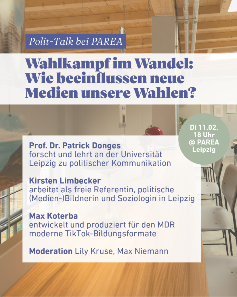 Dazu freuen wir uns auf einen kurzen Impuls aus der Forschung von Prof. Dr. Patrick Donges (forscht und lehrt zu politischer Kommunikation am IfKMW, Uni Leipzig) und danach einen spannenden Panel Talk mit Kirsten Limbecker (freie Referentin, politische Bildnerin) und Max Koterba (Redakteur beim MDR, Fokus TikTok-Bildungsformate).